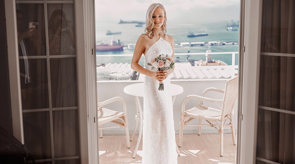 En esta ocación comenzamos en el emblemático hotel the Rock Gibraltar, frente al telesférico y con imporesionantes vistas hacia la bahia de Algeciras, desde su habitaciones nos deslumbró la novia con un impresionante vestido compuesto de escamas blancas que reflejaban la luz solar y hacían un bonito y elegante efecto al fotografiarlo.